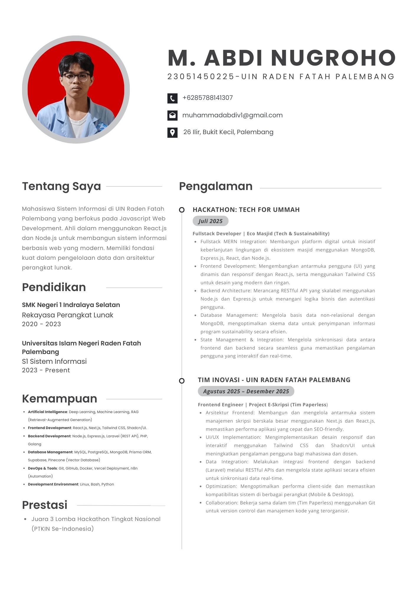 Sebagai mahasiswa Sistem Informasi UIN Raden Fatah Palembang, fokus profesional saya berpusat pada integrasi arsitektur data dengan solusi perangkat lunak yang skalabel. Saya berdedikasi untuk mentransformasi kompleksitas teknis menjadi sistem yang efisien dan tepat guna bagi kebutuhan bisnis modern.