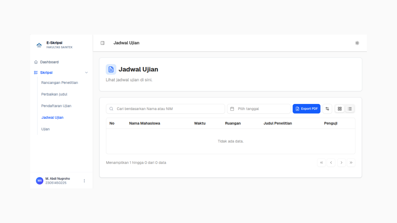 Mengoordinasi pengembangan antarmuka pengguna untuk platform manajemen tugas akhir universitas, sekaligus bertanggung jawab penuh atas standarisasi dokumentasi pengujian sistem guna memastikan reliabilitas aplikasi.